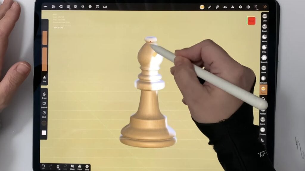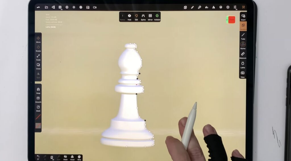 Chess pieces are generally symmetrical to the -y axis in space, so they are super easy to build. Here I just used the ”lathe” tool to extract the shape, and then I overpainted the piece so that it looks realistic.