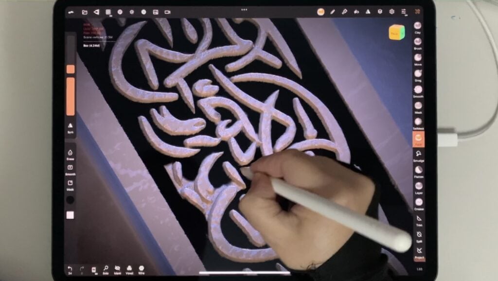 Generally, I’m happy with today’s results. This doesn’t mean that I did not have problems. I will skip the part where I had no precision when cutting hard surfaces, and go straight to stamping. I mentioned before that the key with sculpting apps/programs is using as few vertices as possible. Sometimes, however, it is impossible to stay low. Here for example I wanted to transfer the design below on the hammer. (The design was drawn digitally on ipad pro, in procreate app, then it loaded as an ”alpha”on Nomad Sculpt)