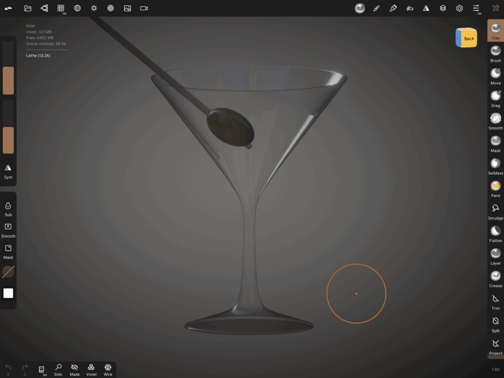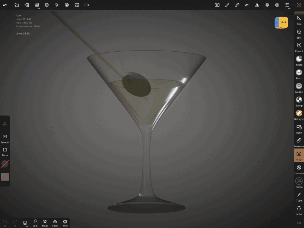 So I did a Martini! (I am in urgent need of alcohol I guess) Shaken not stirred. It was the second time I did transparent material within transparent material, namely liquid within a glass. This time I had a different approach but I couldn’t find a solid solution. (this would make a great pun if I could talk technical stuff. You see, in Nomad Sculpt, I made the liquid solid!) In the end, in order for the liquid martini to be seen through the glass, the canvas has to be tilted to a specific angle. No idea why… I hope it’s a matter of my inexperience, and not a matter of the app.