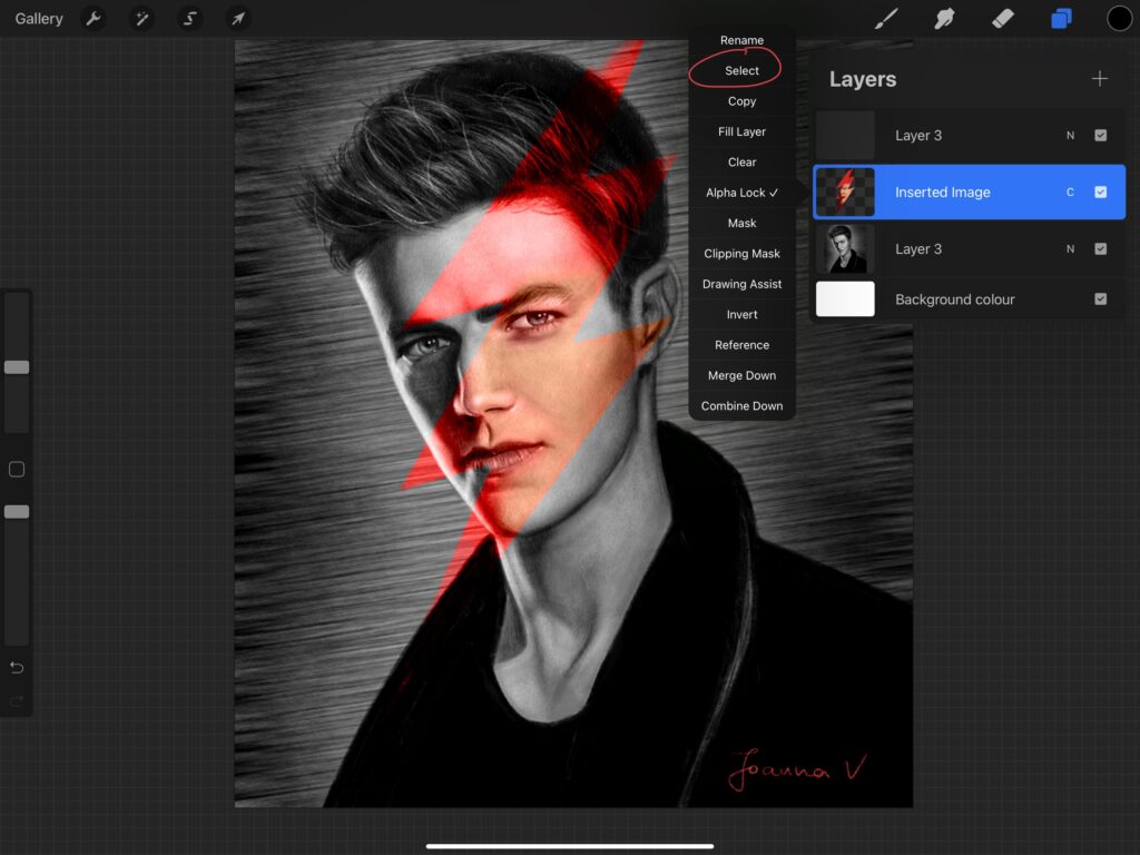 And now comes Alpha Lock. I want to use my lightning shape as a mask, to be able to draw only within the borders of the shape. I go on and “alpha lock” the layer, which does exactly this. It “locks” the pixels, the contents of the layer, so that you can only alter these and these only. In order to “alpha lock” a layer, you need to slide two fingers across the thumbnail of the layer, from left to right. The thumbnail looks patterned like the image below.