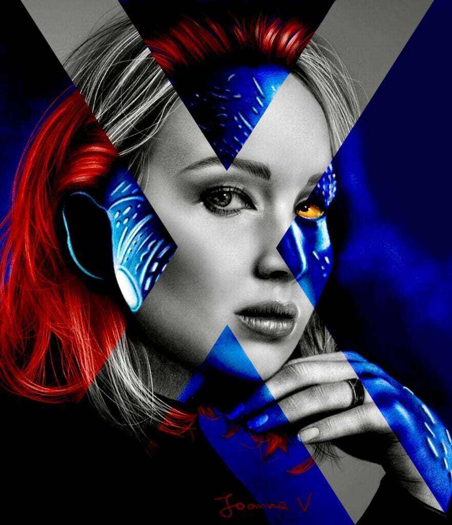 An x-shaped design of Jennifer Lawrence / Mystique. Painted in 2014, in photoshop, with a Wacom intuos tablet. (I’m sorry for the crappy quality, it looks like the original file is lost. 😢 This one here, is right from my social media at that time) Ok, before I start commenting on my old work, I’ll show you the new one and then compare the two of them. So, fast forward to 2021.