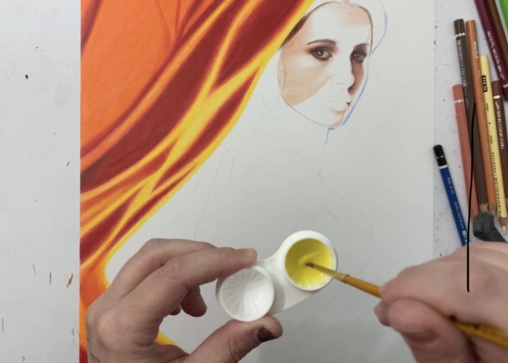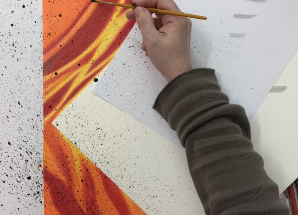 Back to the drawing: Below is what the background looks like before the splatters. Quite simple, I didn’t blend everything out, so it is neither detailed, nor smooth. I just layered three colors and blended minimally using only the pencils. At this point I wanna add that some artists use solvents such as mineral oils to blend the background and the result supposedly looks very smooth. For some reason this method NEVER worked for me. Don’t know why, but any advice is more that welcome!