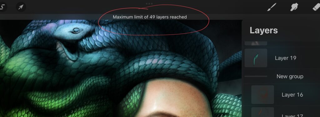 I hate myself for mentioning this, cause it is artistically wrong, almost … unethical I would say! BUT if pixel size is not so much of an issue, you can solve the problem if you shrink your canvas. To be honest this is not something I normally do, I wouldn’t trade size for extra layers, (mind you, most of my work is photorealistic, so details do matter) however, depending on your needs, you might want to consider shrinking your canvas.
