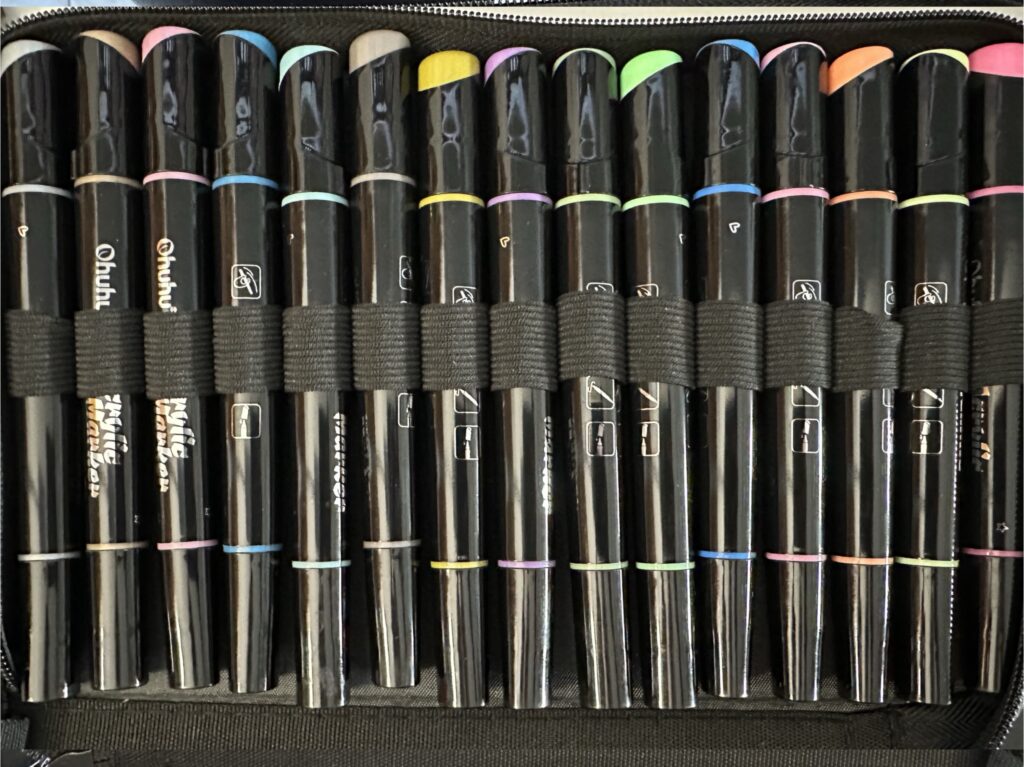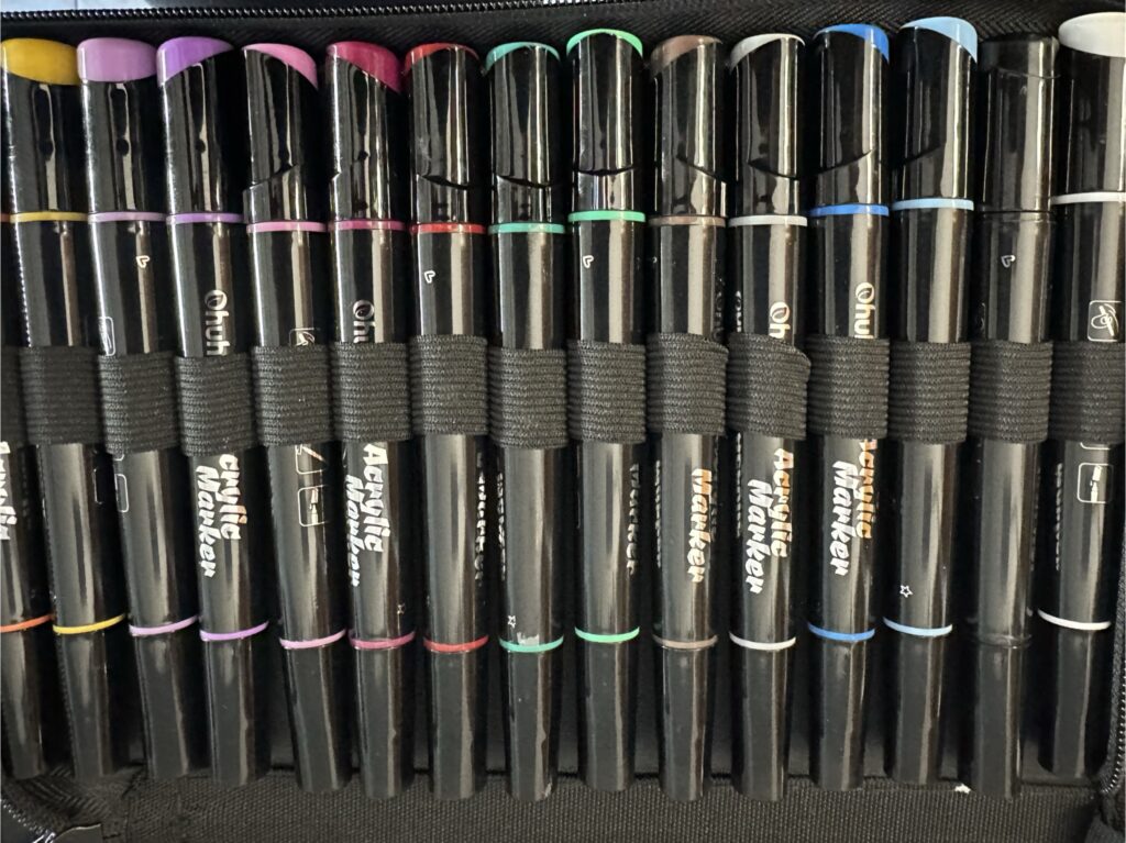 I got the 30-piece acrylic markers set, which comes in a beautiful “knit-like” case. I am not sure if it is a marketing thing or just random, but the case comes with outlines that can be colored in. I certainly did so! It makes sense, since acrylic markers are usually marketed as “markers that can draw on any surface”.
