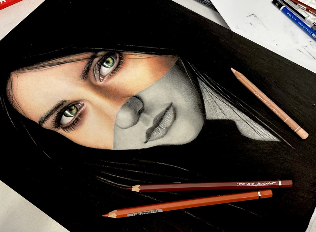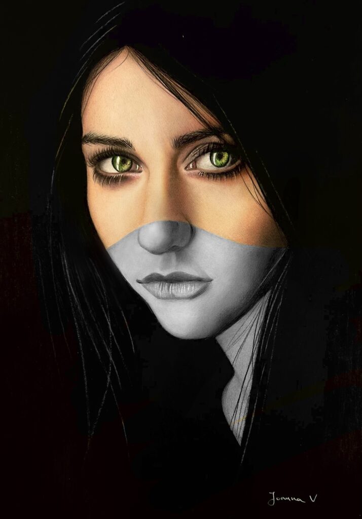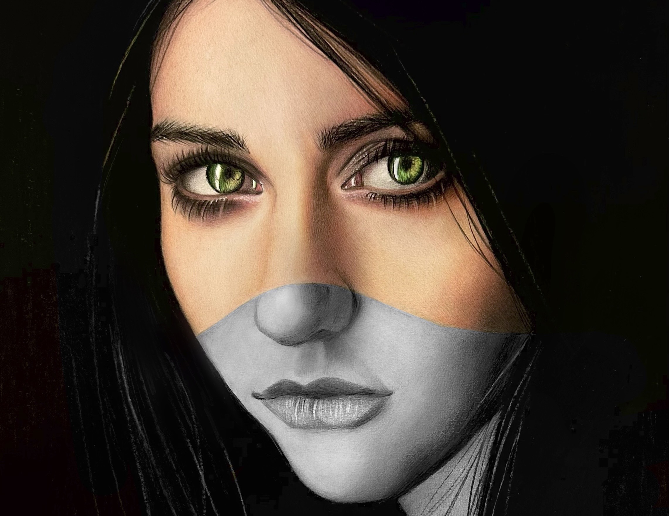Censored II. The eyes “speak” but the words fail, they are muted, filtered, masked. Graphite and colored pencils on Winsor&Newton smooth surface cartridge pad 220gsm.