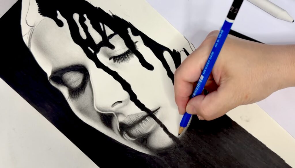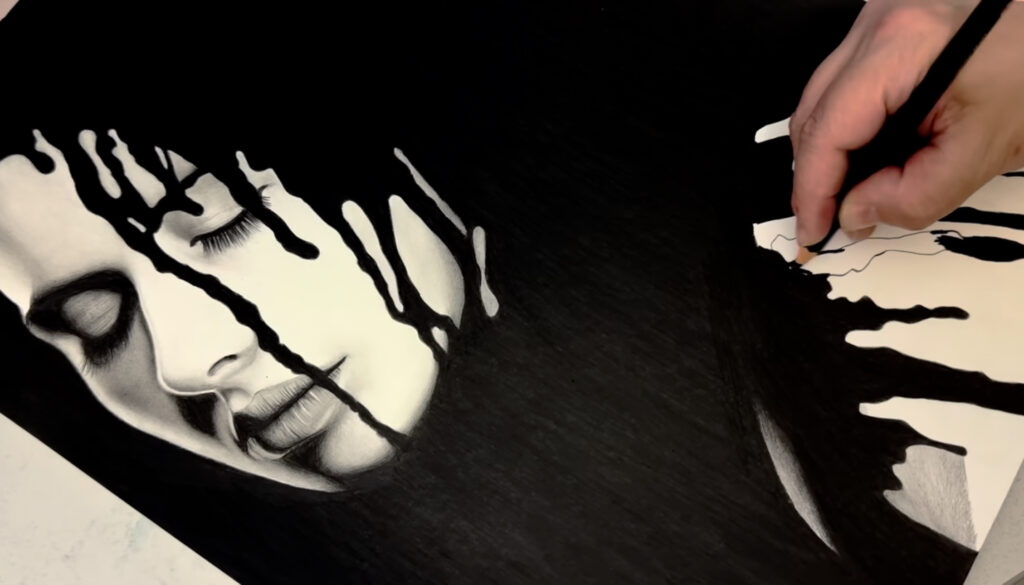 Engulfed by her thoughts, by her faults, by her needs by her deeds. Submerged so deep that she’s slowly consumed by the void. Graphite on Winsor&Newton smooth surface cartridge pad 220gsm.
