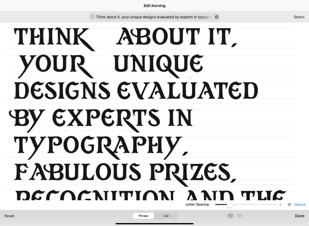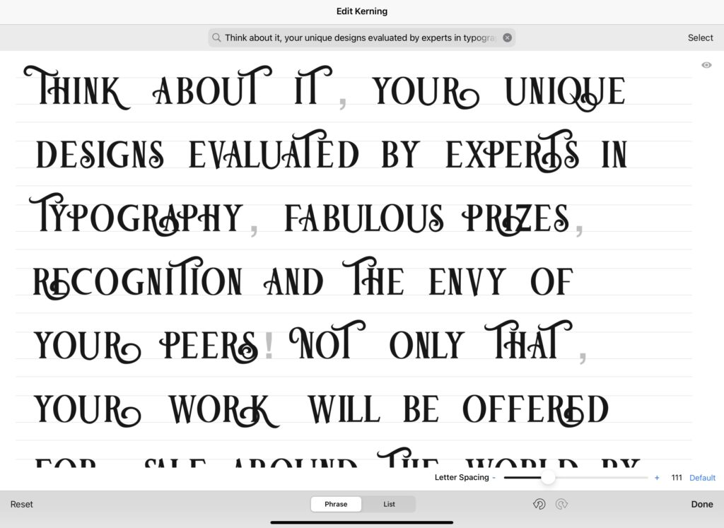 Kerning is the process of adjusting the spacing between characters in a proportional font, usually to achieve a visually pleasing result. In iFontMaker kernings are a joy to work on. Not only it is easy to work on kernings, but it is visually appealing, a real joy to adjust them real time.