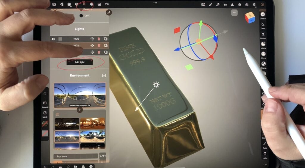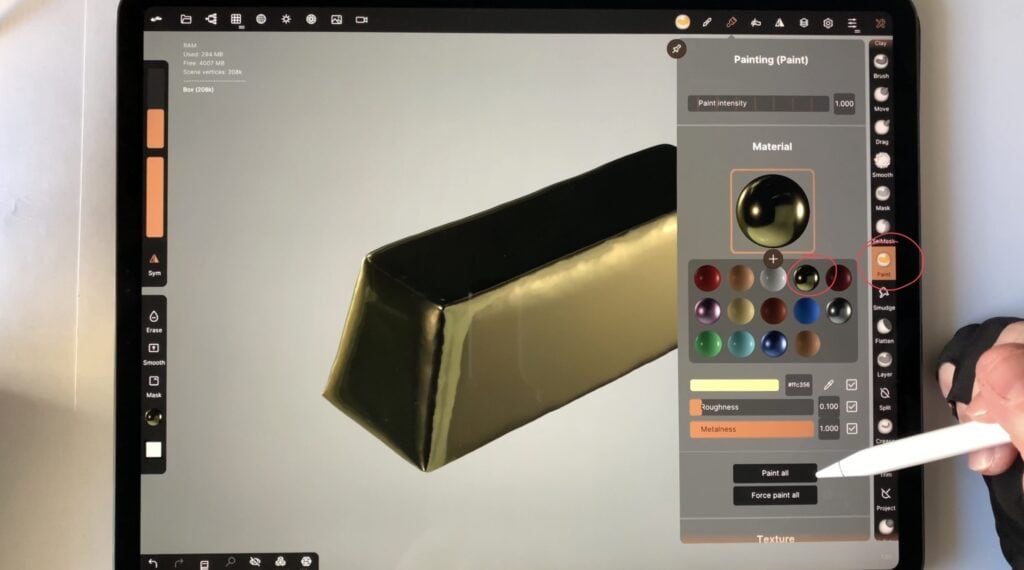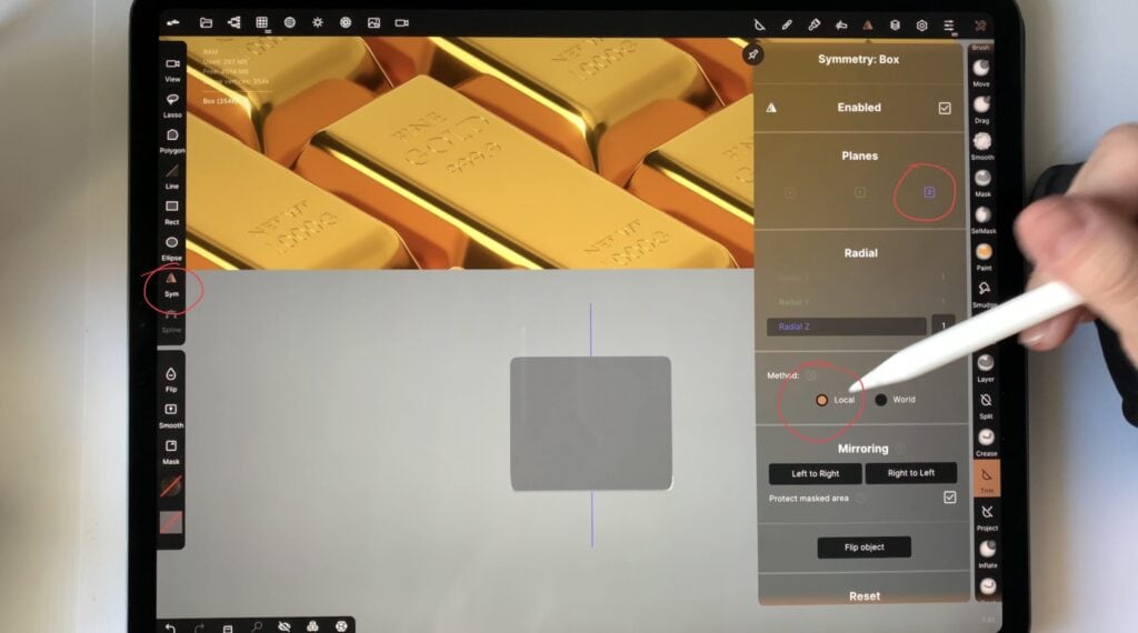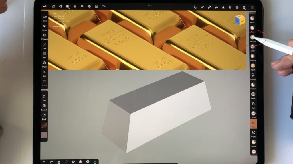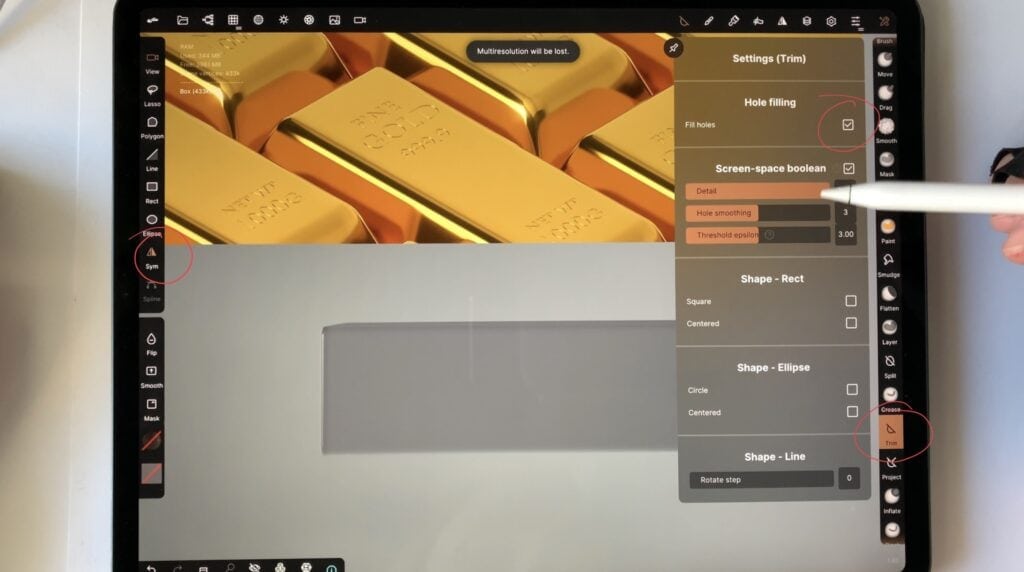 Next I will trim my shape so that it is not a “perfect” rectangle, but it has a nice trapeze-like shape, just like the bar of gold on my reference. Make sure you tick “fill holes” and that you have symmetry on.