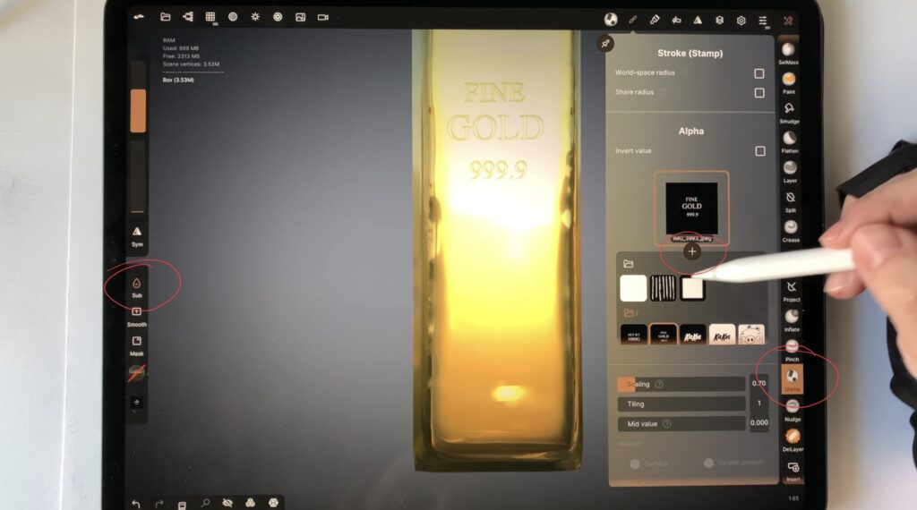 Now I will use the stamp tool to create the engravings. I load the images I just created, and with “sub” turned on, I “stamp” them on the bar. And that’s all!