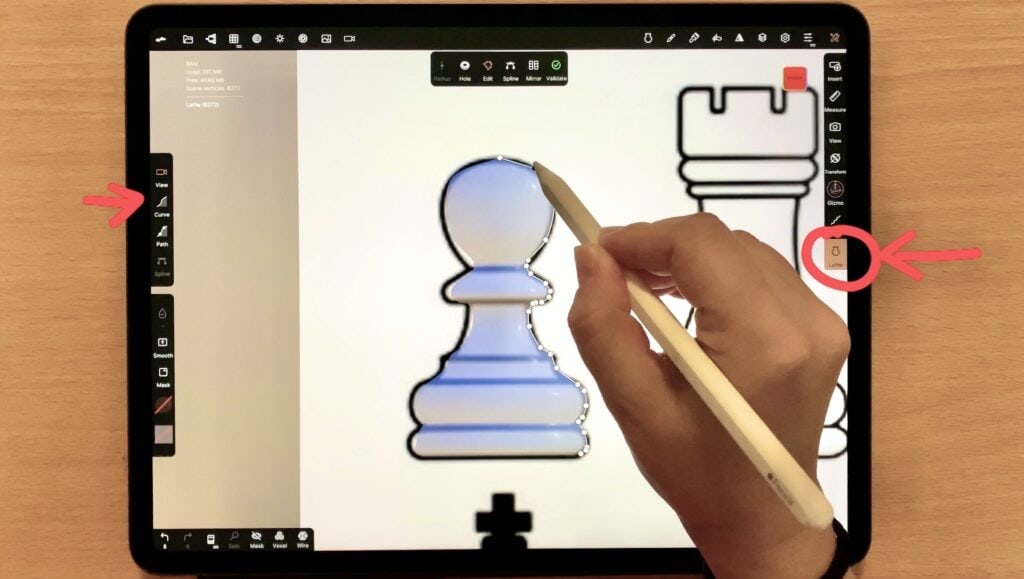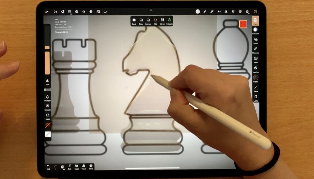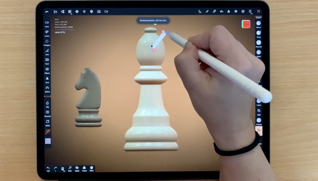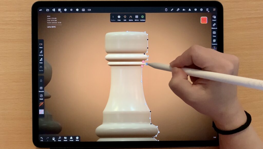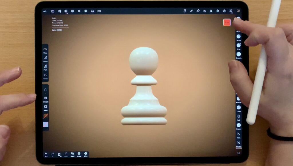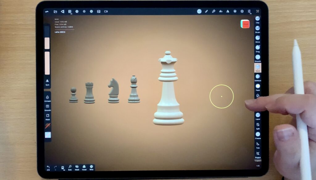There’s this fantastic tool in Nomad Sculpt, the “lathe” tool and basically what it does is create a symmetrical object around an axis. Well, guess what! Most chess pieces are symmetrical to the y-axis! The pawn piece in particular is totally symmetrical, no “flaws” whatsoever. So what I am doing, is take the lathe tool and trace the right (or left if you prefer) side of the object. Tada! It’s done! Could you think of something easier?