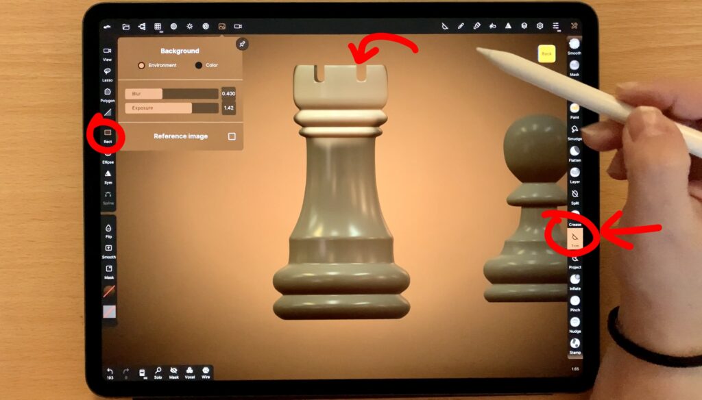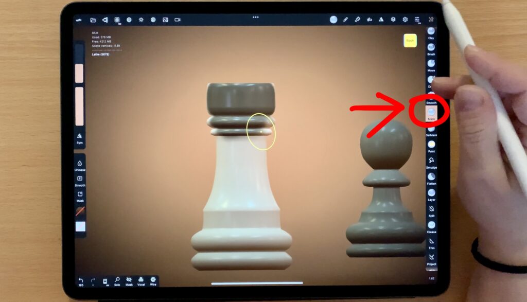 I am repeating what I did with the Knight. Firstly I am using the lathe tool to trace the outline. Then I alternate the mask tool and the trim tool to create the dents. Because these dents are slightly different than those of the Rook, I make the cuts while in top view.