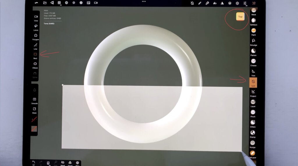 I’m starting off by deleting the default cube and adding a torus. Exact size doesn’t matter, just keep in mind that the dimensions of the torus will determine how thick the coil will be. Then, while on top view, I take the “split” tool and divide the torus approximately in half.