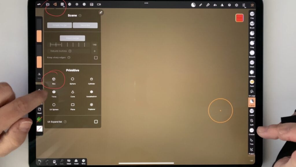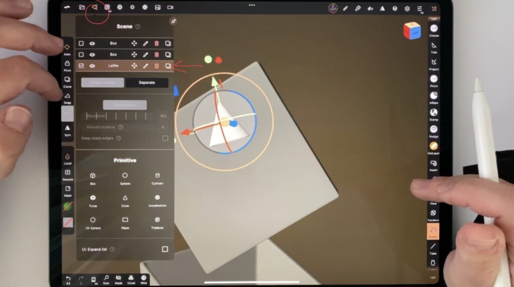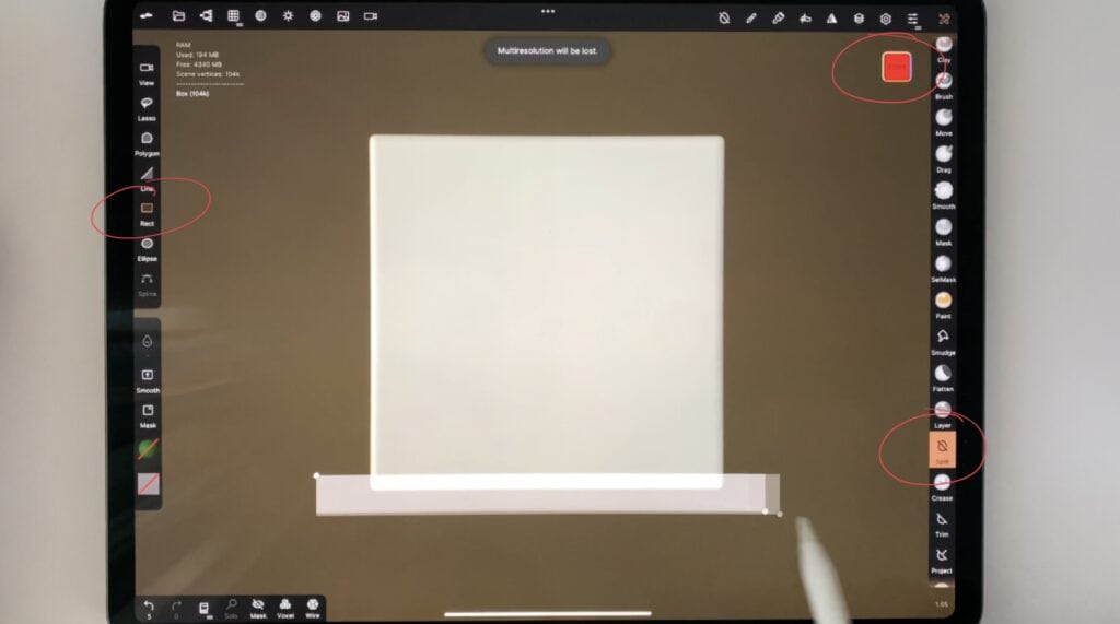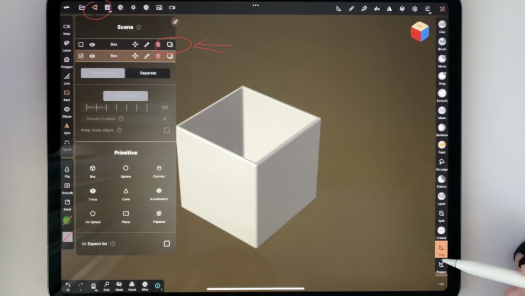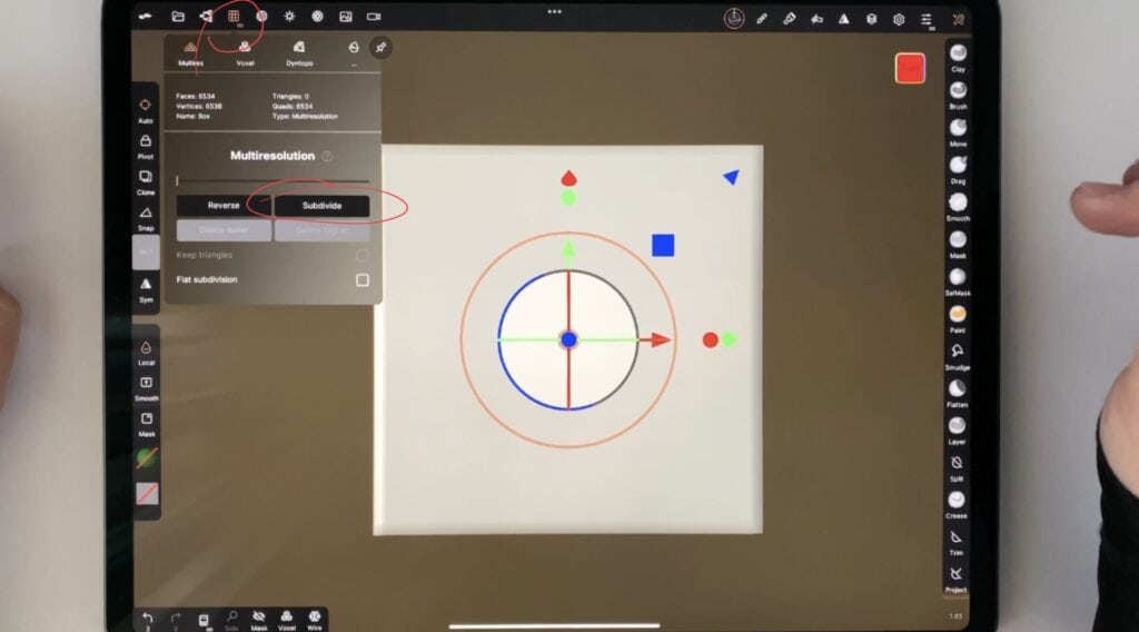 While in the resolution tab, I am tapping the subdivide button a few times. To explain what subdivision is and how it affects our 3D model, is a whole chapter of its own. For the sake of this tutorial, suffice to say that subdivision multiplies the vertices by four, thus increasing the resolution, which comes in handy when we are doing a lot of dividing and cutting – just like we are about to do! However high resolution comes with a price, don’t get enthusiastic and get the highest resolution you can. (Why? Once again, a chapter of its own, but you can read about my personal experience here)