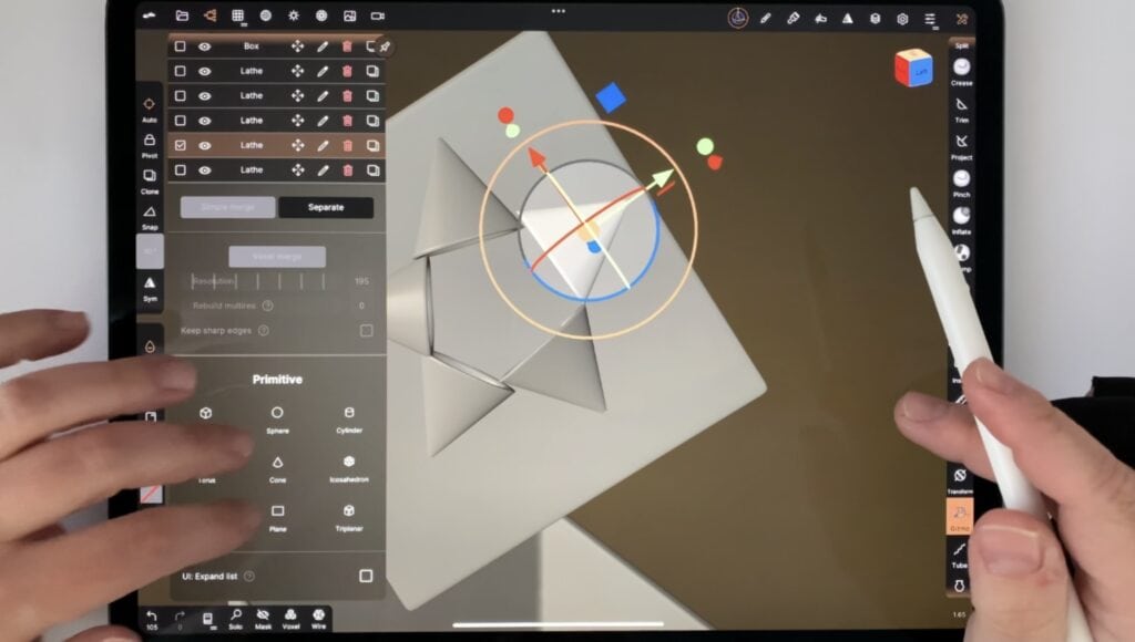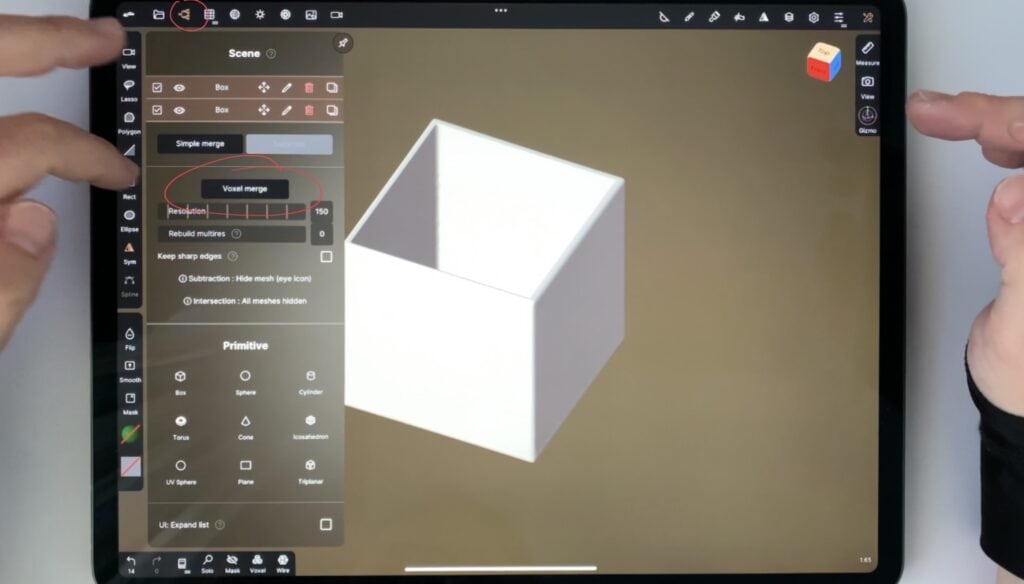 Tha’t it. I now tick both boxes on the scene menu, and tap “voxel merge”.