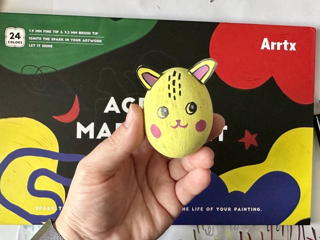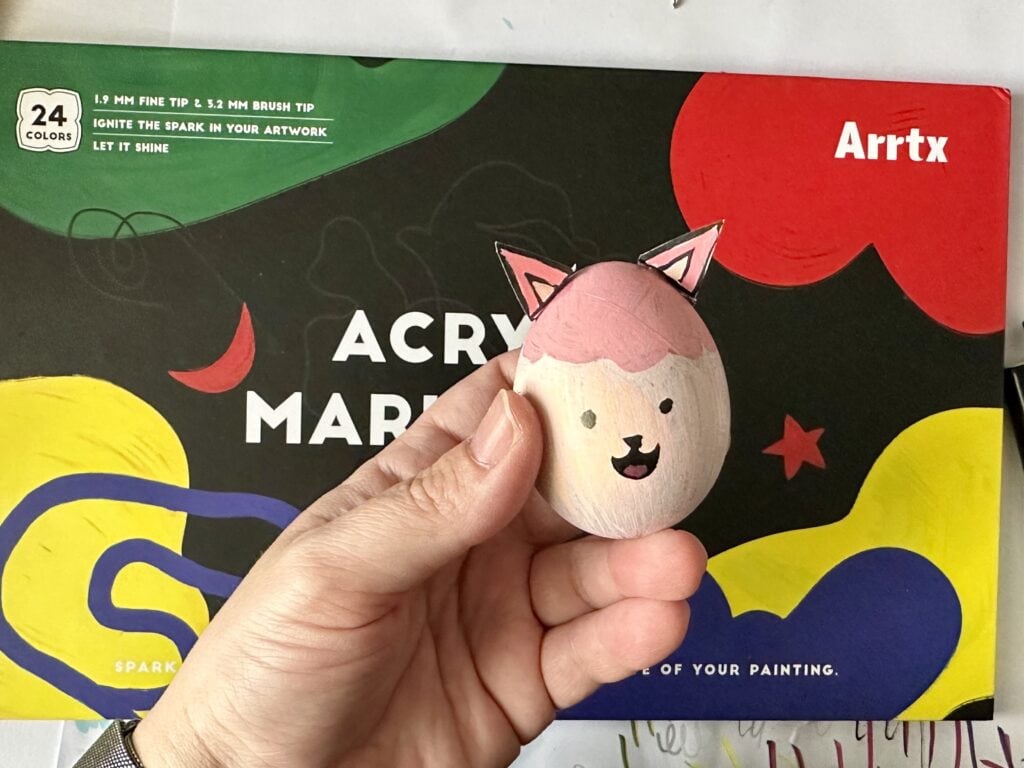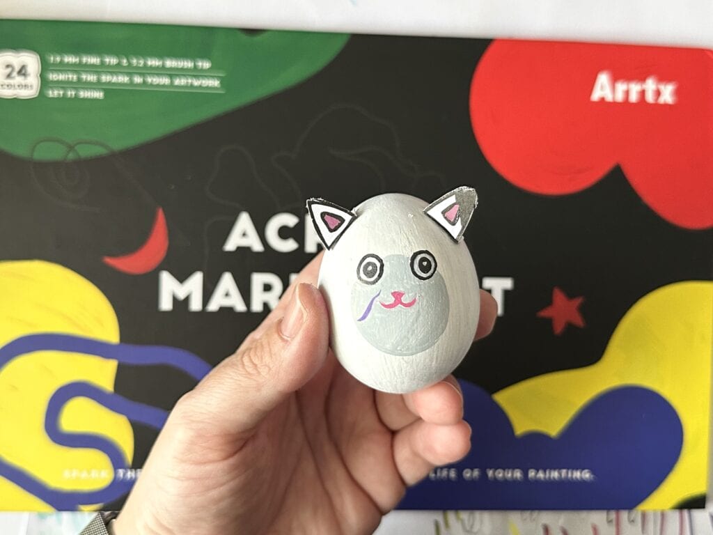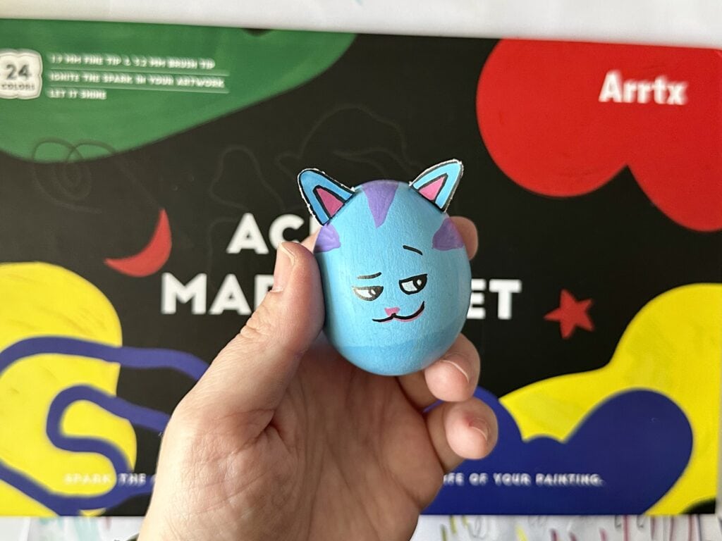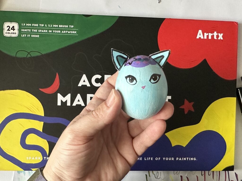 I used Arrtx acrylic and arrtx metallic markers (Arrtx is my new favorite brand, check out what I think about their markers). Generally you need something opaque and permanent, because painting on eggs isn’t easy. Takes a lot of patience to draw on a curved, slippery surface, where paint takes forever to dry. (Especially if you are a professional artist. Takes a lot of courage to showcase your flaws!)
