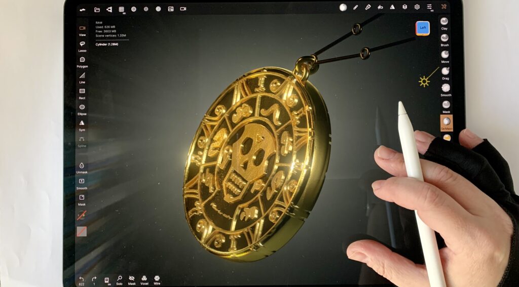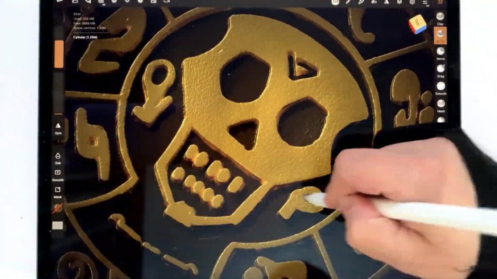 So, it was a matter of time before I tried something pirate-y on 3D. Nomad Sculpt has an amazing tool, the stamp tool. It basically allows you to ”stamp” intricate 2D designs on objects, translating them as 3D graphics. The way it works might seem counter intuitive at first, but once you get the grasp of it, you can sculpt intricate objects really easily.