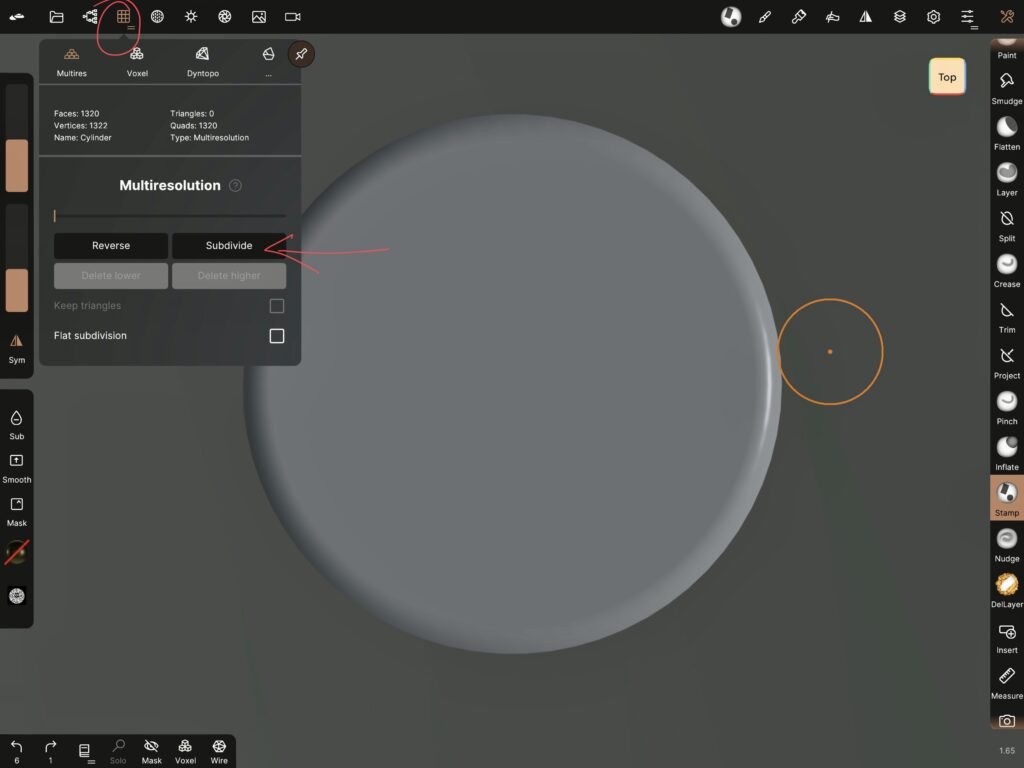 So, what I do is go to the multiresolution tab and tap ”subdivide” a few times.