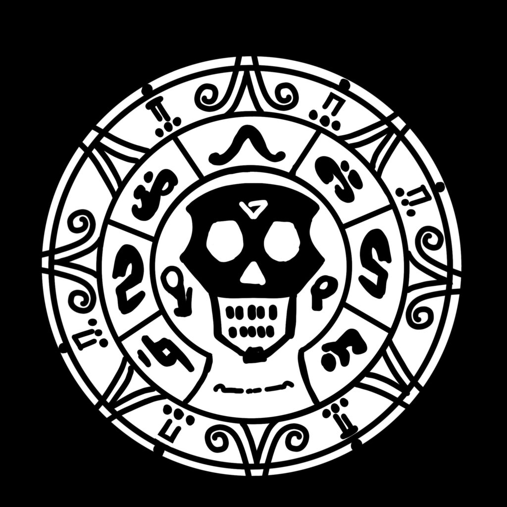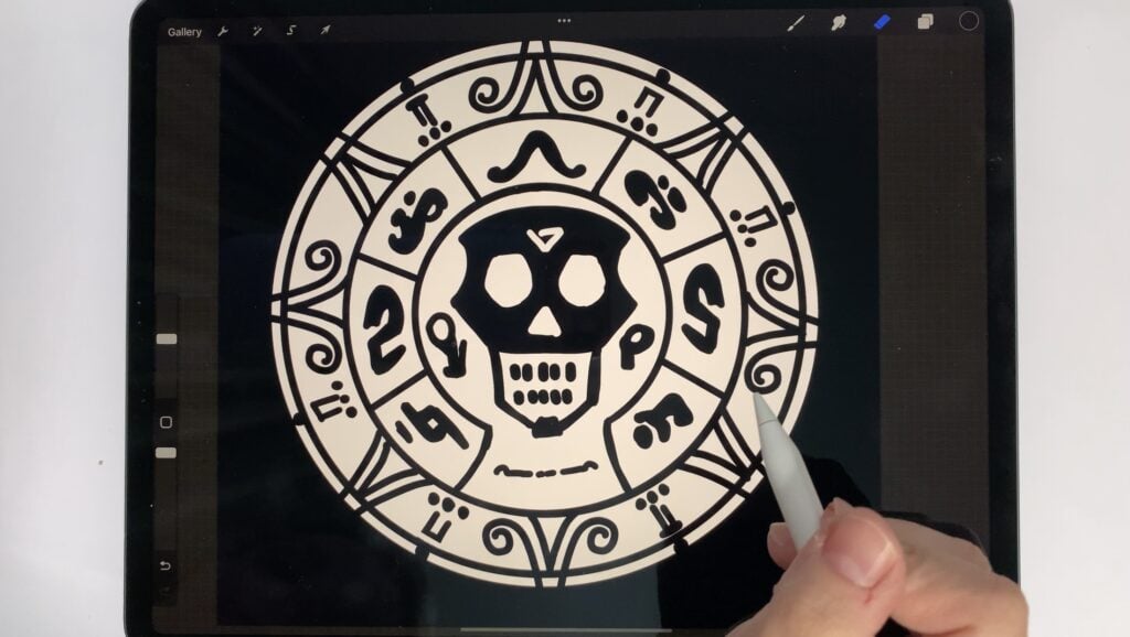 A golden skull design embossed on a circular surface. The first step is to create the ”alpha” in procreate (or the app of your choice). We know that flat surface should be black and maximum depth should be white, so the hand-drawn design looks something like this: