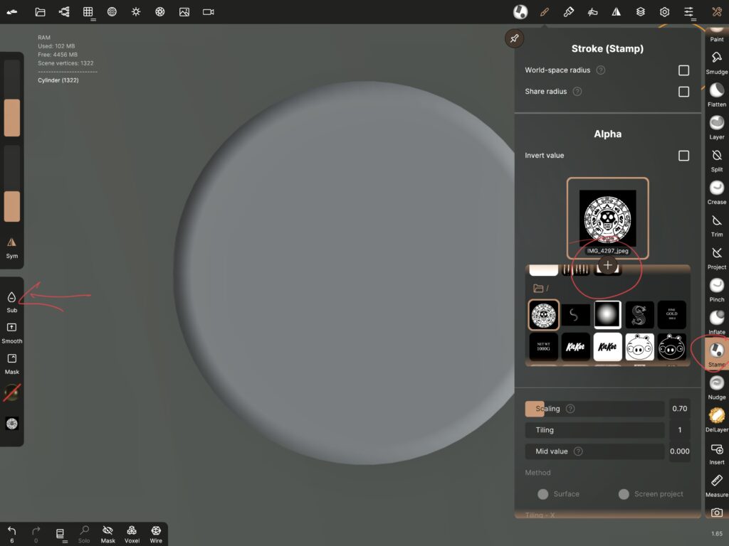 Now it is time for stamping. The stamp tool works better with high resolution objects, the higher the better. I have mentioned many times that high resolution causes many problems and ideally one should work with the minimum resolution that does the job. However, with the stamp tool one cannot escape high resolution. Because this is what happens when I try to stamp my image on a low-res cylinder.