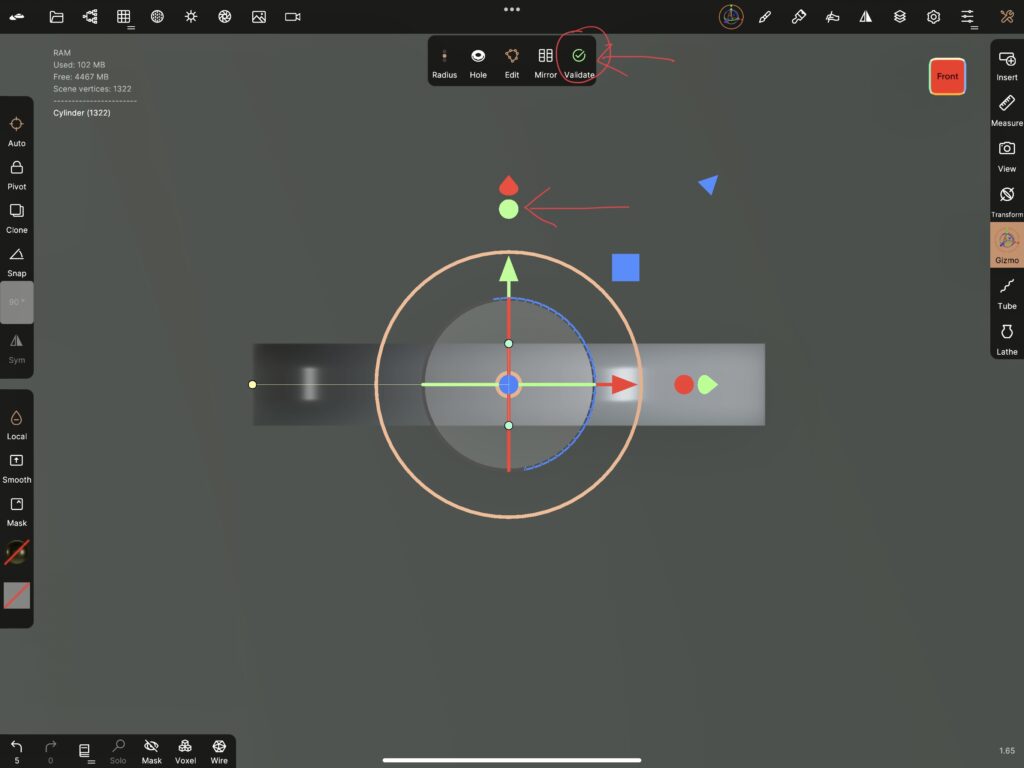 Using the anchor points, I manipulate the cylinder to my liking so that it is not a huge block but an almost flat soon-to-be-a-medallion circle. When I am done, I tap “Validate”.