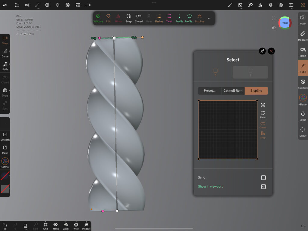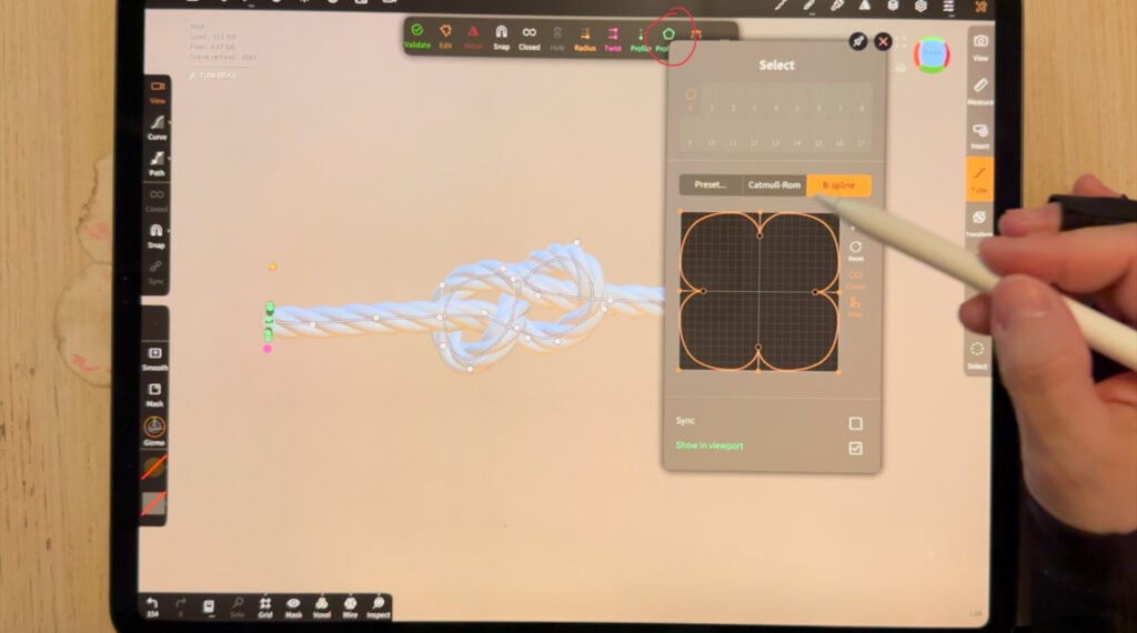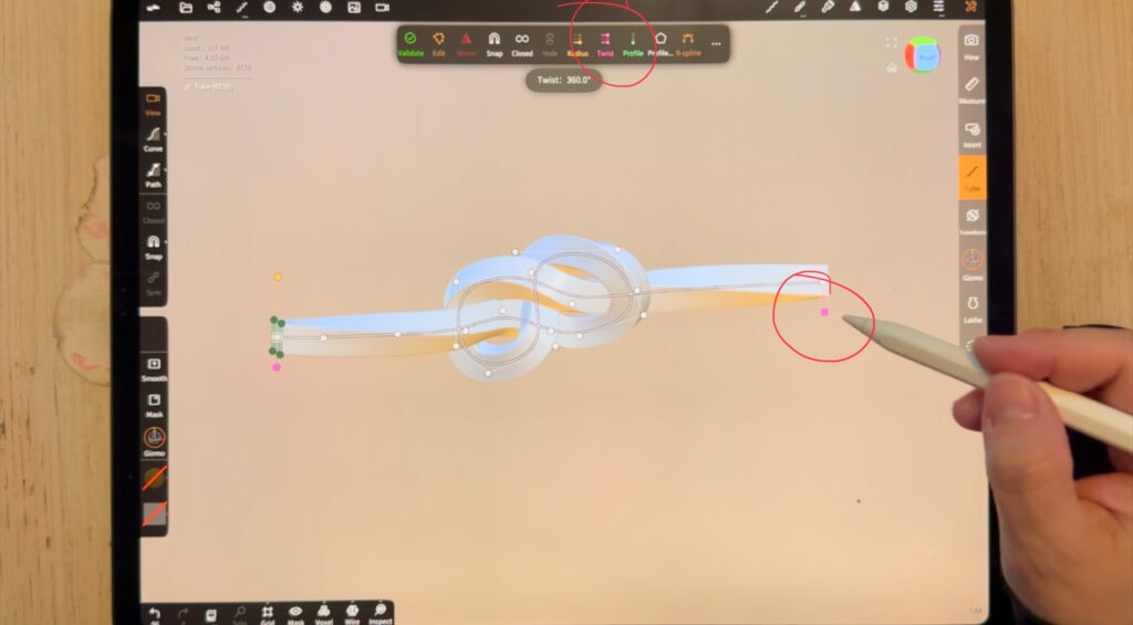 Then tap the “twist” button twice and the “profile” button once. Grab a pink handle and drag until the tube starts swirling. Oh my Gosh, we just got started and it already looks like a rope!