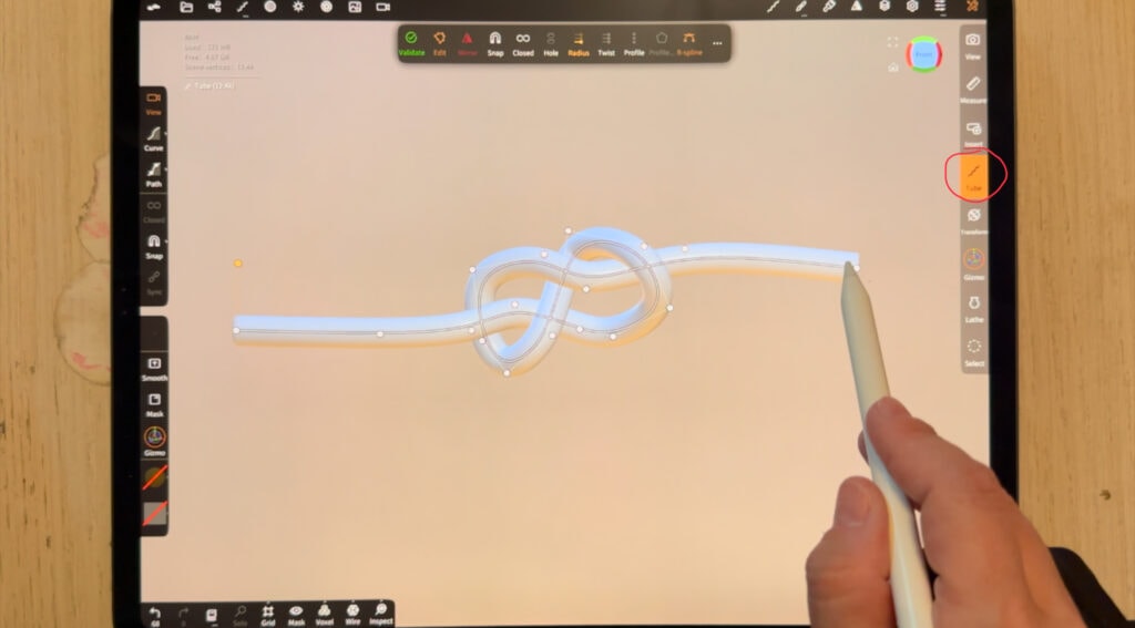 I am beginning with (of course!) the… tube tool. I am simply drawing a shape of my choosing. Personally I went for a knot, but you can make any curve you like.