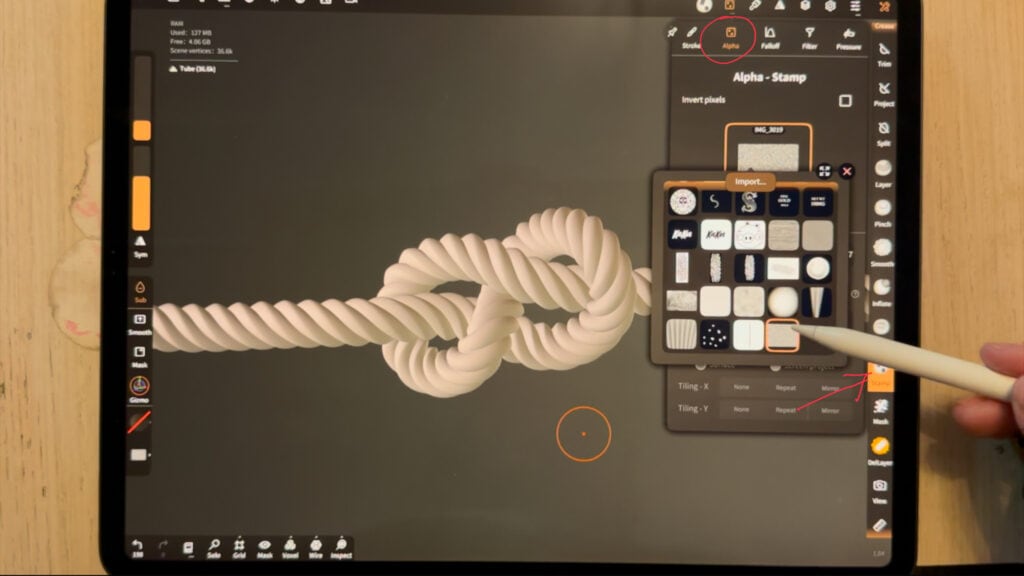 Pro tip: For an extra dose of realism, you can add some texture with the stamp brush. Just use the stamp brush from the left side menu, use an alpha of your choice and brush on the rope. I used a plain noise alpha. I don’t remember if this one came with the app, if it doesn’t I will add it below.